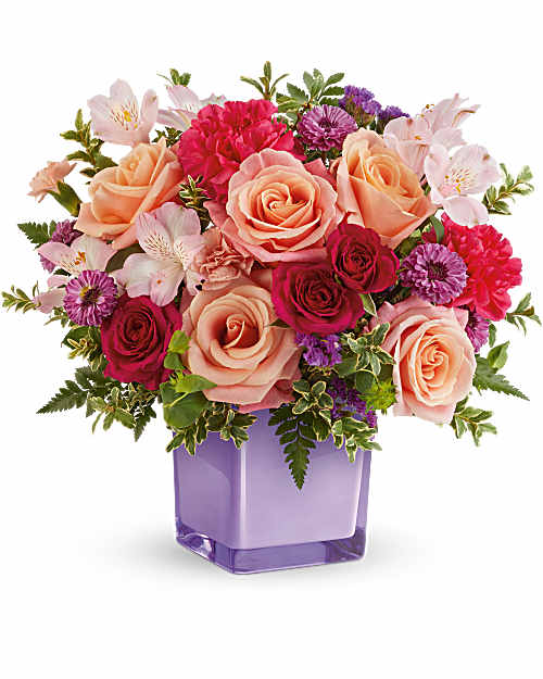 A treat for the senses, this bouquet blends peach, pink, and fuchsia blooms in a radiant purple cube. A refreshing burst of color that brightens any room with effortless charm. Â It includes peach roses, hot pink spray roses, light pink alstroemeria, hot pink carnations, peach miniature carnations, purple button...