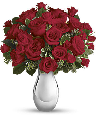 Add some romance with this rich arrangement of luxurious flowers in classic colors. Red roses, snow white lilies and playful daisies are gathered in a glassvase they can continue to enjoy! Red roses, white asiatic lilies, white daisy spray chrysanthemums, mi ni red carnations and sprigs of bupleurum and salal...