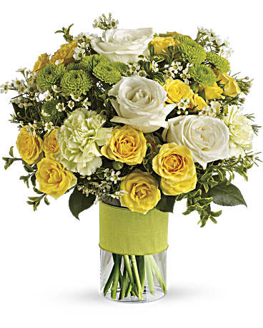 You could call or email that special someone, but why not put your feelings into flowers? They'll love this elegant array of white and yellow roses and other favorites in a stylish cylinder vase. They'll want to thank you in person. This charming bouquet includes white roses, yellow spray roses,...