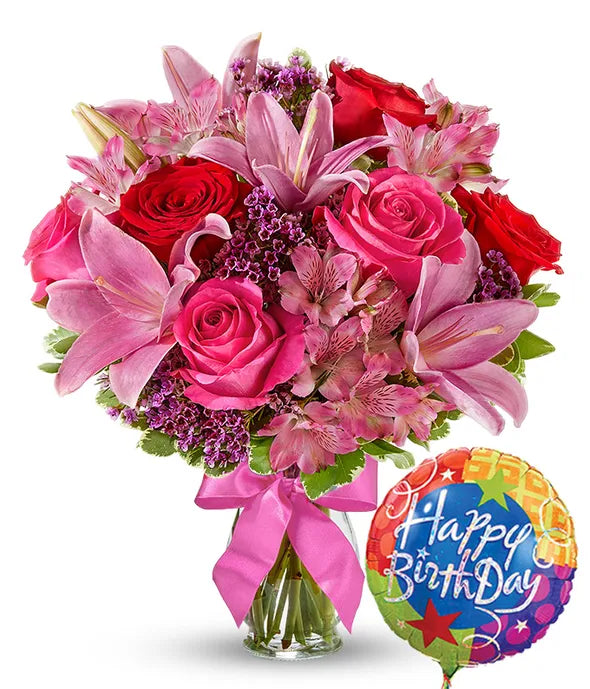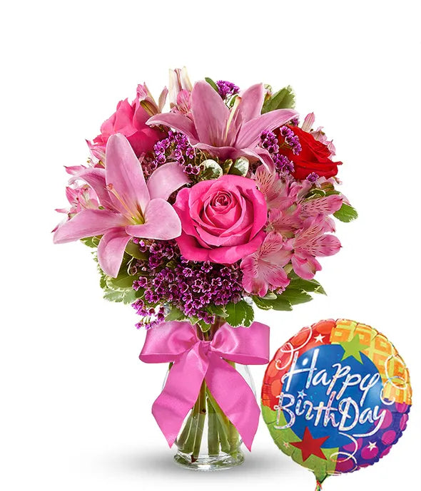 Send your best birthday wishes with this lovely bouquet of Asiatic lilies, waxflower, alstroemeria, roses and a birthday mylar balloon. Delivered in a clear glass fluted vase, this bouquet makes a wonderful gift they won't forget.