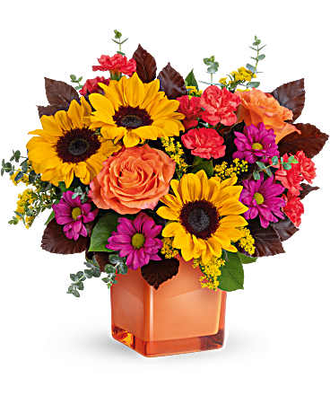 It features orange roses, orange miniature carnations, yellow sunflowers, purple daisy spray chrysanthemums, solidago, copper beech, spiral eucalyptus, and salal in a glass cube