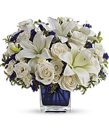 Like gazing into a clear blue sky, this serene arrangement soothes the soul and cheers the heart. Its creamy roses and snowy lilies are arranged in our dazzling glass cube.