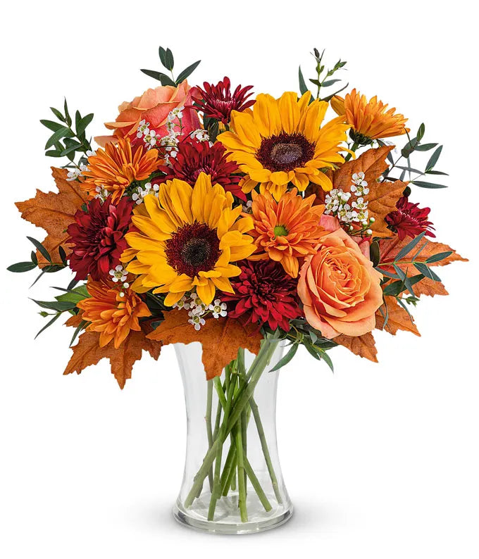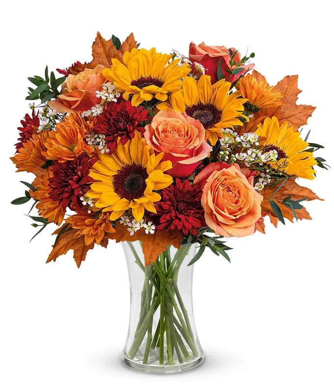 Brighten someone's day with this joyful floral gift, featuring vibrant orange roses, rich red cushion spray mums, bronze daisy spray mums, and sunny yellow sunflowers. Accented with seasonal floral greenery and beautifully arranged in class glass vase, this gift brings a warm, autumnal touch to any home or celebration.