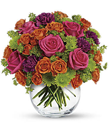 Show your happy side by sending this gorgeous bouquet of hot pink roses, orange spray roses and other fabulous faves in a charming glass bubble bowl. They'll love the gift, and you for having such amazingly good taste.