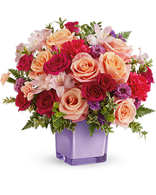 A treat for the senses, this bouquet blends peach, pink, and fuchsia blooms in a radiant purple cube. A refreshing burst of color that brightens any room with...