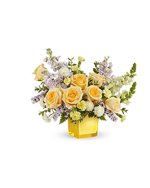Bright and serene, the Sunshine Dreams bouquet blends soft yellow roses and cheerful white blooms with hints of lavender, creating a radiant display of happiness in a glowing yellow glass cube.
