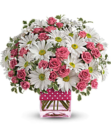 Pop, go the flowers! This energetic pink and white bouquet pairs fresh white daisies with hot pink roses in a light pink glass cube vase. It's a fun, summery choice for your favorite girly girl!