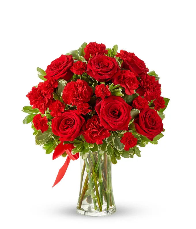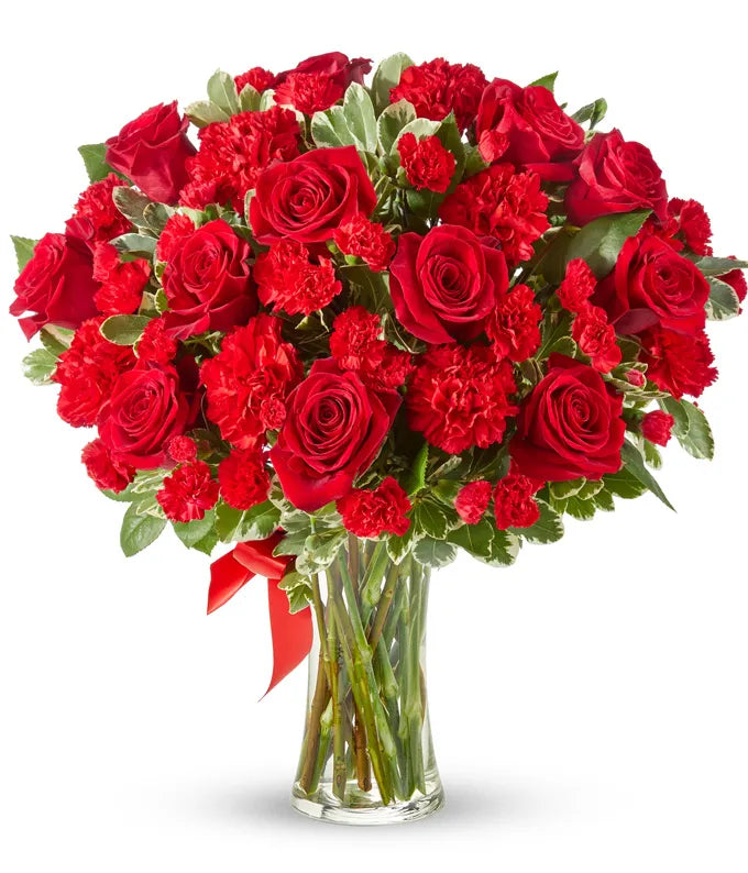 Let your love bloom with this beautiful, lush bouquet. This all red flower arrangement is hand-arranged by a local florist near you with classic red roses, along with red carnations. All the red flowers make this gift a wonderful way of letting someone in your life know they are important to you and you appreciate all the love they give you. The red roses and carnations are delivered in a clear glass vase with a red ribbon tied around the center.